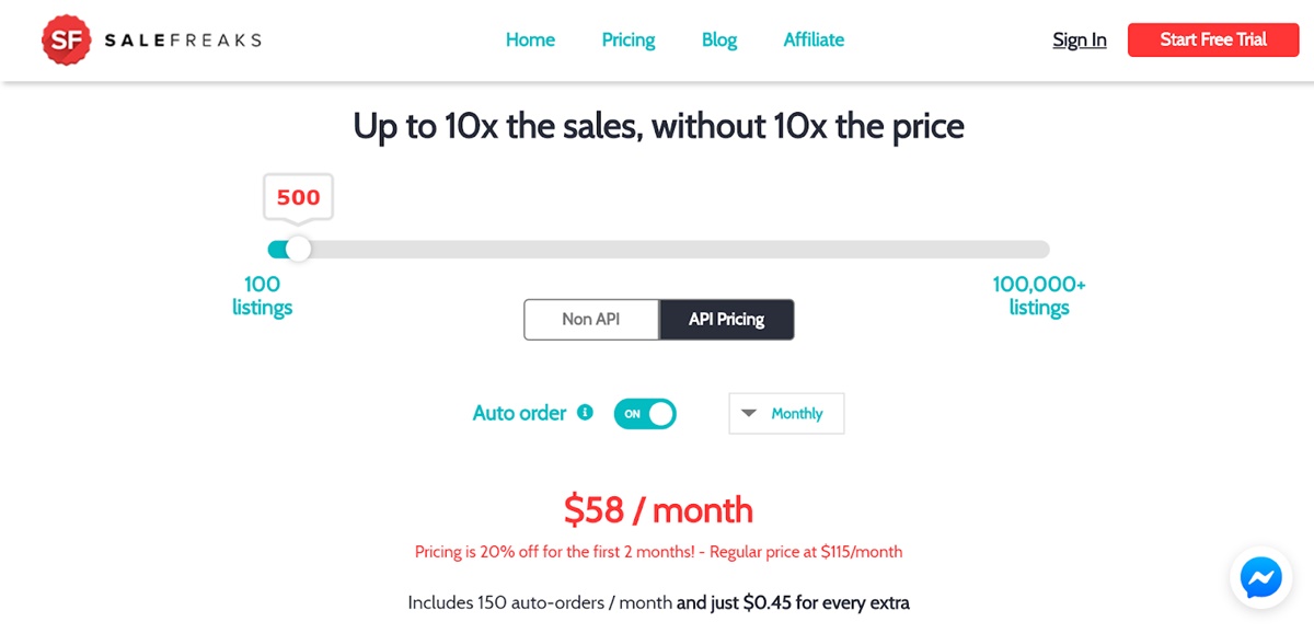 En cuanto a los precios, los planes de precios de Salefreaks se basan en los rangos de cotización y otras características. Puede buscar su plan favorito deslizando la barra de precios. Ofrecen planes mensuales y anuales, y los precios también difieren según su preferencia personal de API y opciones de pedido automático. Especialmente, si elige el servicio de precios API con la función de pedido automático, obtendrá un 20% de descuento para el plan mensual y un 100% de descuento para el plan anual en los primeros 2 meses.