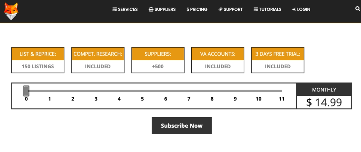 Acerca de los precios, Price-fox ofrece 12 niveles de precios diferentes que se muestran en un control deslizante de precios que van desde $ 14,99 con 150 listados hasta $ 599,99 con 20,000 listados. Eso es bastante asequible en comparación con otras herramientas de dropshipping de eBay. Para experimentar Price-fox con fines de prueba, puede probar la prueba gratuita de 3 días y luego decidir cuál es su paquete preferido mencionado anteriormente.