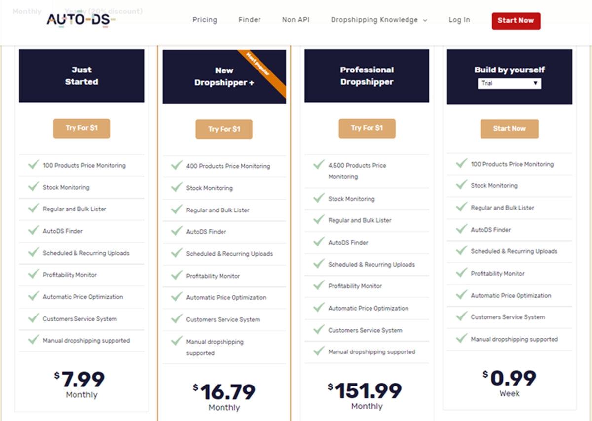 En cuanto a los precios, puede obtener acceso a 30 pedidos automatizados, monitoreo de precios y existencias, y 100 artículos de alta conversión con una prueba de $ 1. Estos artículos aquí son productos de venta rápida con la capacidad de aumentar sus ventas y ganancias. Hay 3 planes de precios mensuales en total, que van desde $ 7.99 para principiantes hasta $ 151.99 para dropshippers profesionales.