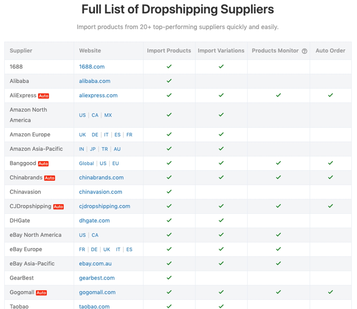 La gestión de dropshipping de DSM Tool garantiza no solo la calidad sino también la cantidad en el apoyo a los dropshippers para generar ventas en eBay. La herramienta cuenta con más de 50 proveedores, incluidos proveedores de eBay de grandes mercados como Canadá, Reino Unido, Estados Unidos, Alemania, Italia, Francia, España y Australia. Este es un lugar ideal para minimizar su esfuerzo por encontrar, enumerar y cambiar el precio de los productos en eBay mientras se enfoca en hacer crecer su negocio.