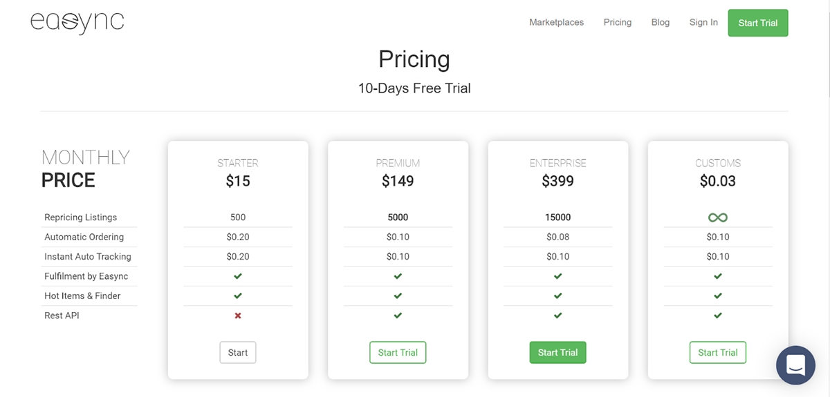 Los planes de precios en Easync se basan en gran medida en la escala de su tienda y los propósitos de uso, que van desde $ 15 a $ 399 por mes. Puede obtener acceso a una prueba personalizada de 10 días con $ 0.03 que incluye listados de revisión de precios indefinidos, cumplimiento por parte de Easync, artículos populares y buscador y API de descanso. Gaste $ 0.02 extra para probar el pedido automático y el seguimiento automático instantáneo también.