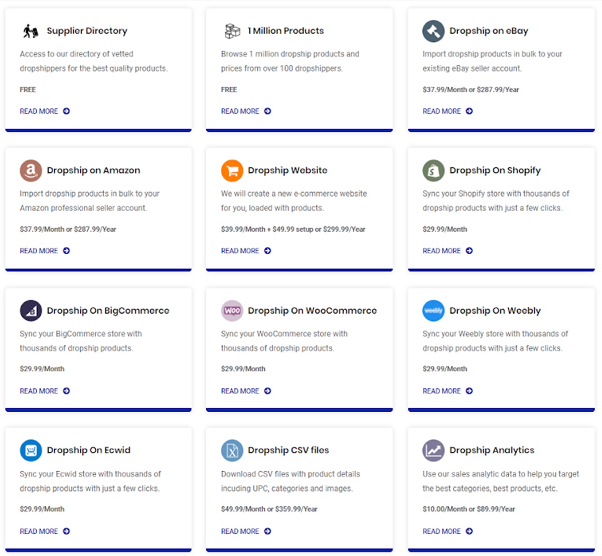 En cuanto a los precios, los planes varían según las plataformas proveedoras. No hay tarifa de registro para Wholesale2B, y también obtendrá acceso a dropshippers examinados y productos de alta calidad sin costo alguno. Otras opciones múltiples tienen precios diversos, que van desde $29.99 a $49.99 por mes. Ver más detalles en la siguiente tabla.