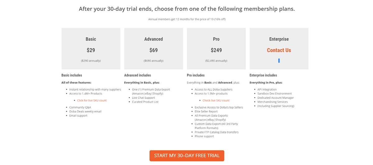 Puede experimentar todas estas funciones en una prueba gratuita de 30 días para la prueba inicial. Si está satisfecho con el servicio, puede optar por los planes premium pagados para disfrutar de más funciones y una atención al cliente óptima. Los planes pagos mensuales se ofrecen a $29 para el plan básico, $69 para el plan avanzado y $249 para el plan profesional. Recientemente, Doba ha actualizado una nueva versión Enterprise con más funciones mejoradas, y el precio se decidirá según el acuerdo de ambas partes.