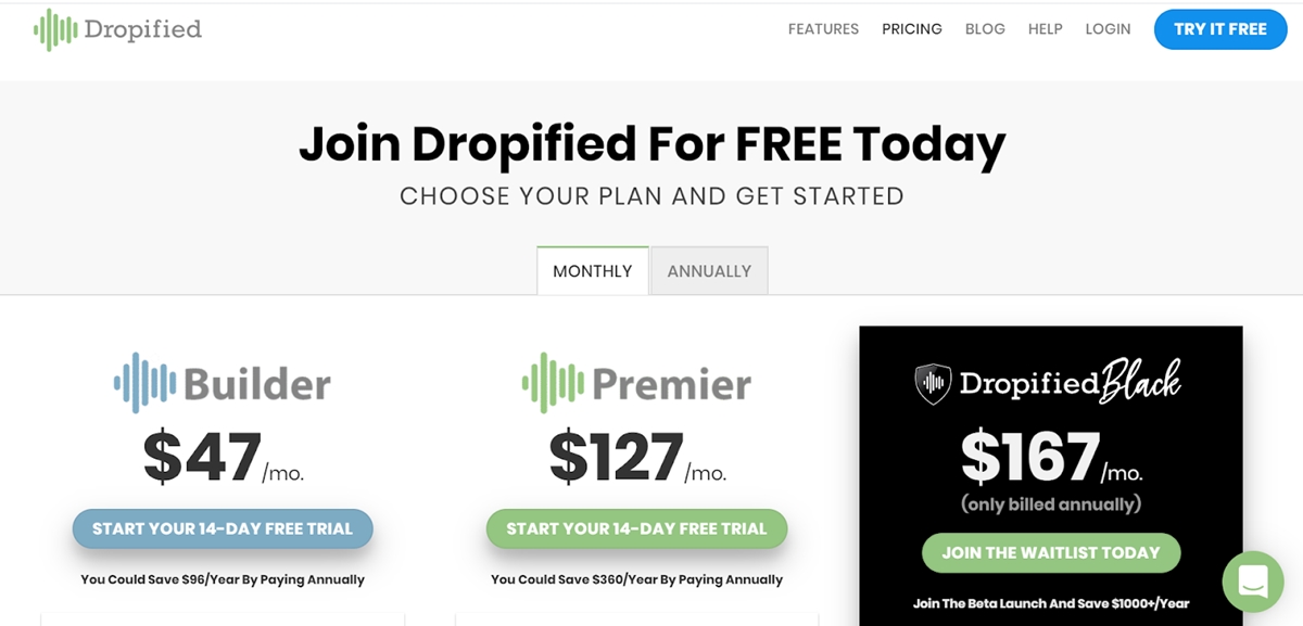 Puede experimentar las funciones de Dropified por adelantado con la prueba gratuita de 14 días. Después de eso, deberá pagar $47 por mes por el plan Builder y $127 por mes por el plan Premier. Se aplican importantes descuentos al elegir el paquete anual. Dropified ha actualizado el plan Dropified Black en el que puede disfrutar de muchas funciones limitadas a solo $ 1997 por año, así que apúrese y únase a la lista de espera.
