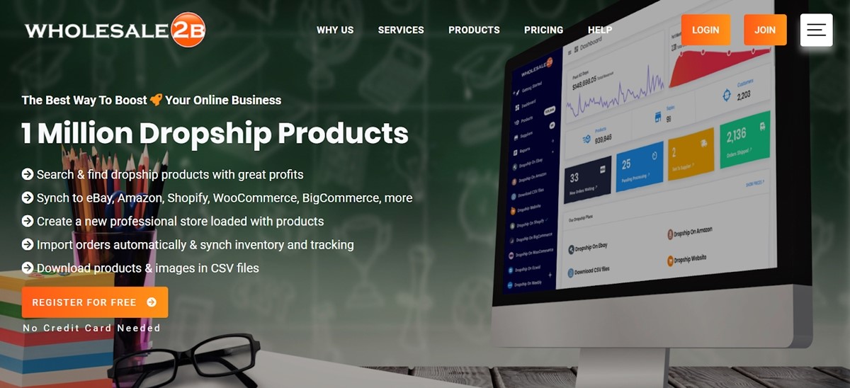 Wholesale2B es famoso por sus integraciones de dropshipping con muchas de las principales plataformas de comercio electrónico como eBay, Amazon, WooCommerce , Shopify y varias otras en una sola cuenta. El software te permite seleccionar entre más de 1 millón de productos y te ayuda a registrar los pedidos con tus proveedores.