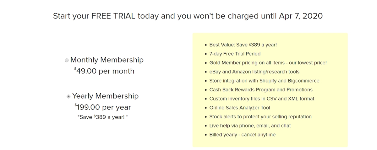 Con Sunrise Wholesale, puede obtener acceso a varios servicios, como un formulario de reembolso automatizado, alerta de seguimiento de inventario a través de un correo electrónico diario, servicio telefónico o fuentes de datos. Puede experimentar estas funciones de forma gratuita con una prueba de 7 días. Cuando finalice la prueba, deberá pagar una tarifa de membresía para los planes pagos desde $ 49 por mes hasta $ 199 por año.