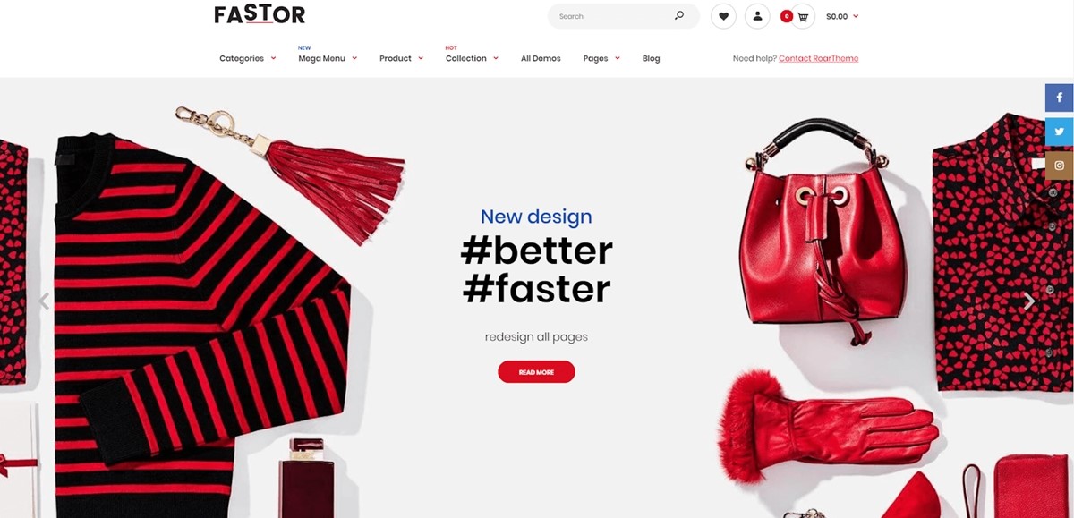 Fastor es uno de los temas de Shopify más profesionales y mejor hechos. Ha introducido muchas características fáciles de usar. Por ejemplo, los clientes nuevos de Fastor reciben siete portadas de páginas de fans de Facebook y opciones de banners Powerful Rich.