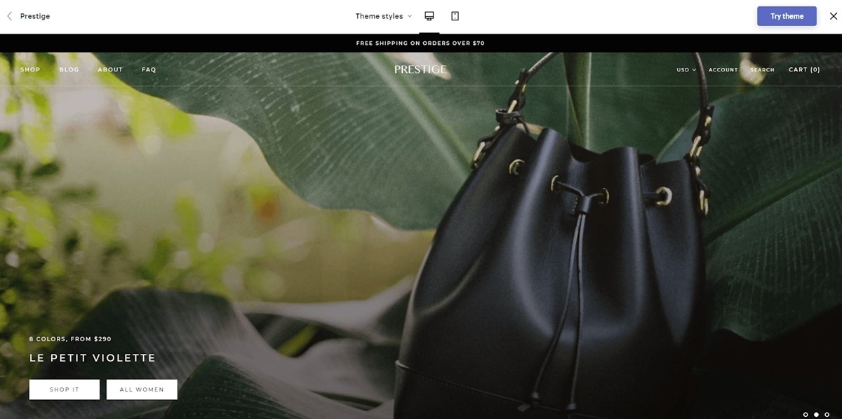 Prestige, uno de los temas más populares en la tienda Shopify Themes, está diseñado para un atractivo de marca premium y de gama alta. Los diseños optimizados permiten contar historias directamente en su página de inicio con imágenes impresionantes.
