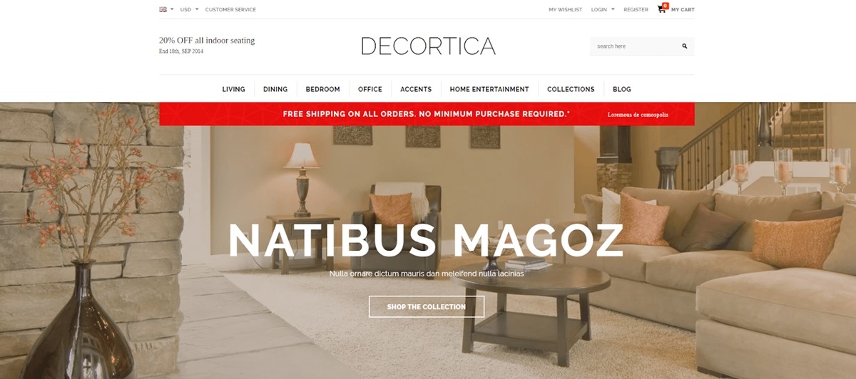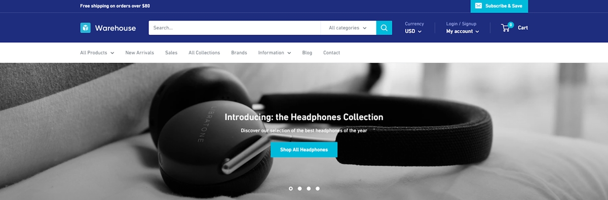Diseñado para exhibir y promocionar un extenso catálogo de productos, Warehouse trae un diseño moderno que muchas tiendas pueden usar y aprovechar. La instalación de los temas permite la búsqueda predictiva para buscar más rápidamente los productos correctos y tener una ventana emergente de salida para alentar a los visitantes a registrarse para recibir correos electrónicos.