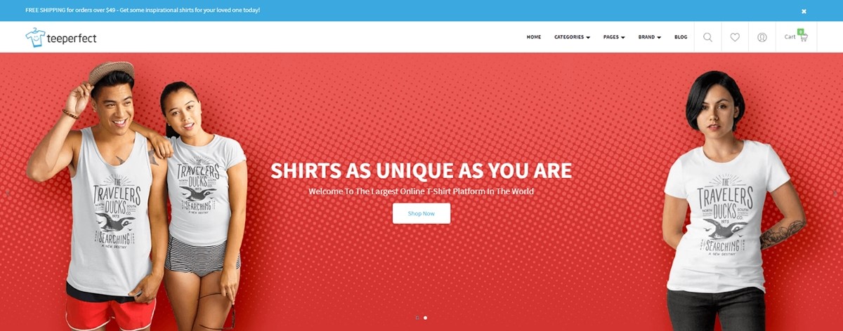 Un gran tema para aquellos que buscan vender productos impresos, camisetas y productos de dropshipping, TeePerfect fue creado por desarrolladores con experiencia en este mercado. El diseño moderno parece inspirador, y hay una excelente interfaz que encantará a los visitantes de su sitio web mientras navegan por su sitio web en pleno funcionamiento. Puede personalizar su sitio gracias a las fuentes y colores ilimitados de Google disponibles a través del personalizador.