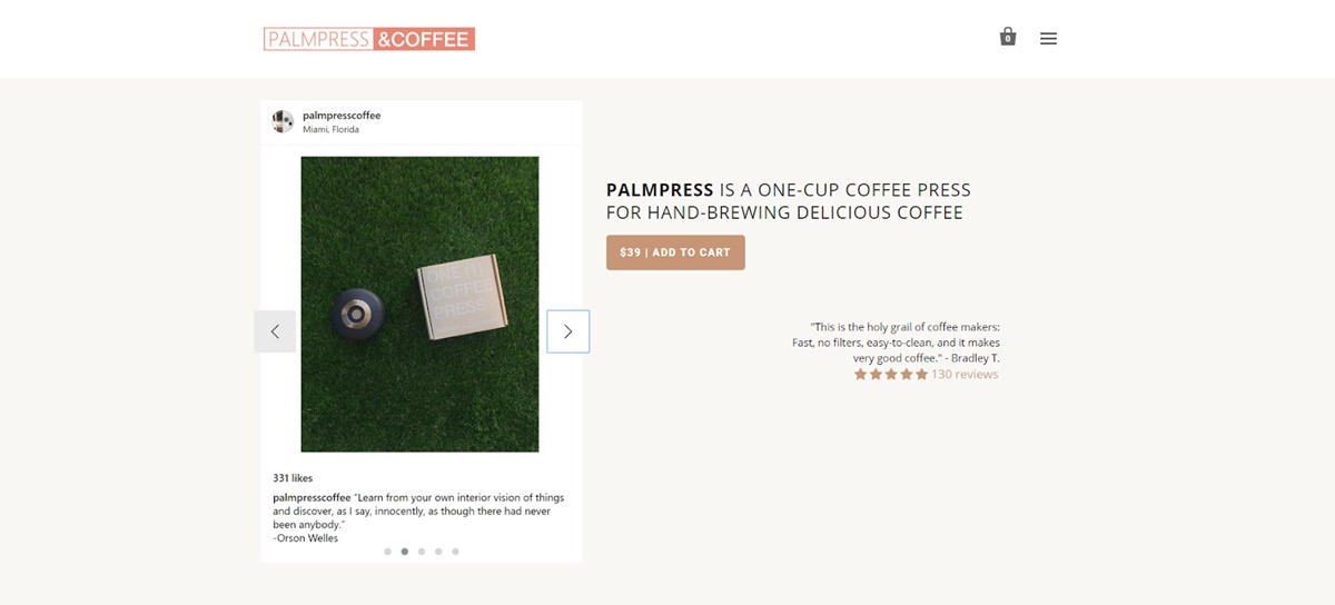 Palmpress es una prensa de café de una taza que brinda una experiencia única de café hecho a sí mismo. En la parte superior de la página de inicio, encontrará las reseñas de los clientes con sus propias imágenes, lo que aumenta la confianza en la marca.