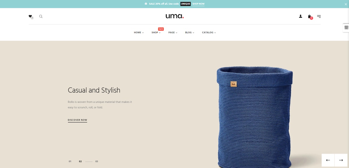 Uma es un tema limpio y minimalista que está diseñado para una excelente tienda Shopify de un solo producto que es creativa y colorida. Verá un diseño de tendencia que muestra fotos brillantes y atractivas que pueden resaltar todas las características de su producto.