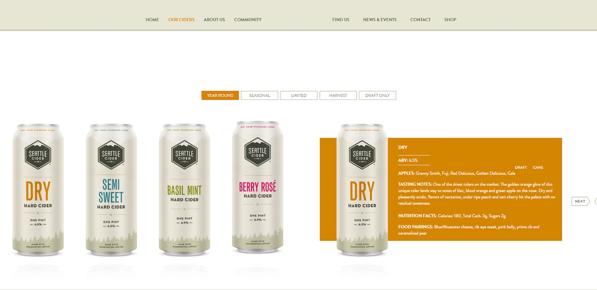 La gente de Seattle Cider Co. hizo un trabajo increíble al crear una página de inicio dinámica y llamativa que cuenta una historia de cómo se hace su sidra y una invitación a su sala de degustación al final.