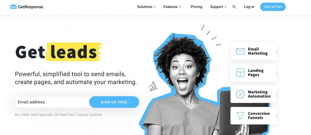 GetResponse es otra gran herramienta de marketing por correo electrónico en el mercado. Le permite crear boletines que se pueden enviar a los suscriptores de sus listas de correo. Con la función de respuesta automática, puede programar y enviar correos electrónicos masivos. Le brinda información detallada y otros datos, como clics, tasas de apertura y otras métricas para sus campañas de marketing por correo electrónico. Esta herramienta también proporciona un generador de páginas de destino para aquellos que necesitan esta función.