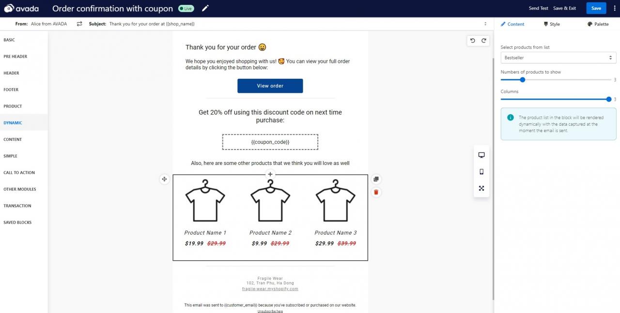 Aquí, dentro de un correo electrónico de confirmación de pedido, puede ver el feed de productos dinámicos en acción. Esta es una función profesional, por lo que deberá actualizar a la versión Pro de AVADA Email Marketing para usarla.