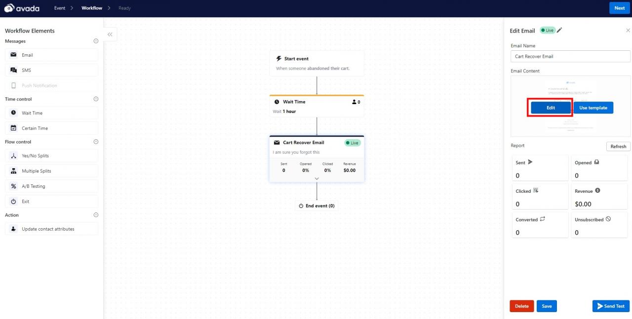 A continuación, veamos el correo electrónico del carrito abandonado y su feed dinámico de productos. Haga clic en el correo electrónico de recuperación del carrito y haga clic en Editar para continuar.