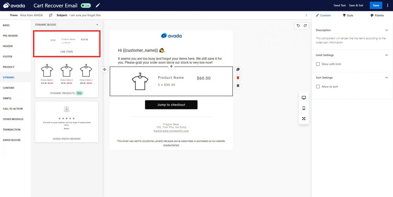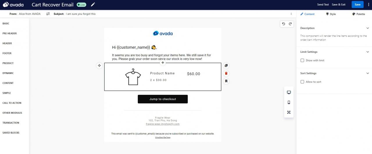 Dentro del editor de correo electrónico, encontrará la plantilla de correo electrónico para el correo electrónico de abandono del carrito . Incluye una copia para notificar a los compradores sobre su carrito abandonado, un feed de productos dinámico que muestra los productos en su carrito y un botón de llamada a la acción con la copia de «Saltar para pagar», que los llevará a la página de pago del carro.