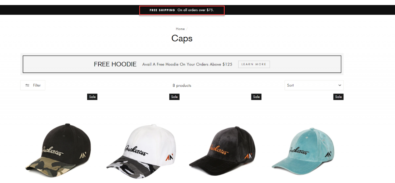 Aestheticnation quería informar a los clientes sobre el costo de envío por adelantado. Decidieron mostrar el anuncio de la barra de envío en la parte superior del sitio de la tienda para ayudar a los clientes a estar siempre al tanto del cargo de envío durante todo su viaje de compras. También saben que el mensaje de envío gratis se cambiará de acuerdo con el valor total del carrito; es la forma en que usan AVADA helo bar como una especie de motivación para alentar a los clientes a agregar más artículos al carrito y obtener oro de envío gratis.