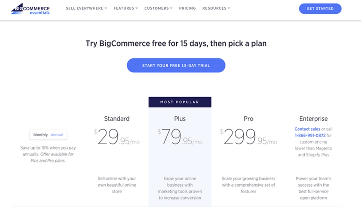 BigCommerce se fundó en 2009. Desde entonces, la compañía ha brindado dos planes para empresas nuevas o pequeñas y medianas, y dos planes premium para empresas grandes o de alto volumen. Cada uno de estos planes viene con varias características que van desde el monitoreo de fraudes, la recuperación de carritos abandonados, hasta calificaciones de productos y muchas más.