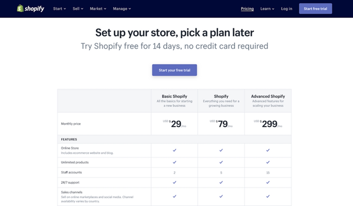 Shopify ofrece una prueba gratuita de 14 días para que puedas probarlo por ti mismo antes de hacer cualquier compromiso financiero. Durante el período de prueba gratuito, puede crear su propia tienda en línea, probar las aplicaciones gratuitas de Shopify y, si es audaz y sigue intentando vender, probablemente también logrará su primera venta con el plan gratuito.