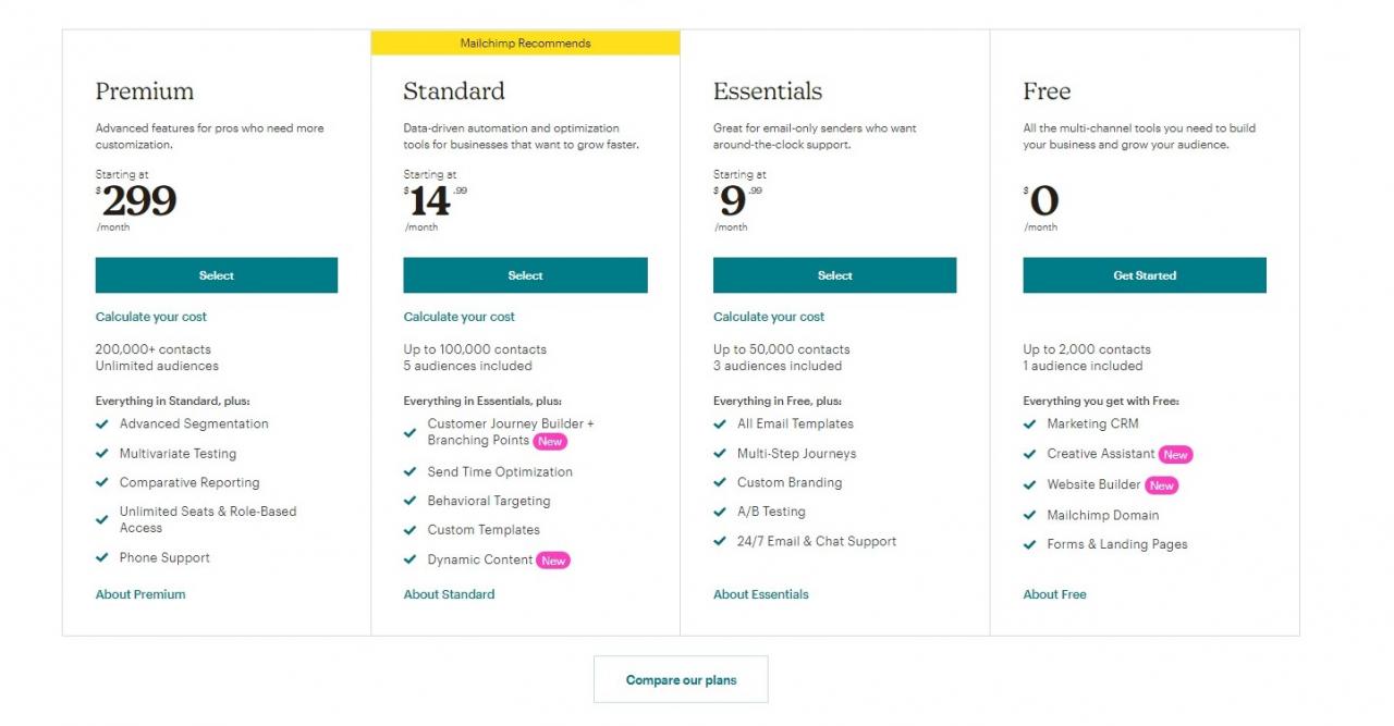 MailChimp es muy rentable en comparación con otras alternativas, especialmente para organizaciones más pequeñas que comienzan con menos de 1000 contactos. El paquete simple «Essentials» comienza en $9.99/mes y cobra alrededor de $5 al mes con contactos extra sobre los primeros 500. Si quieres realizar promociones más A/B severas, necesitas la edición «Premium» por $299/más. mes. Los paquetes adicionales son diferentes y el tamaño es más barato a medida que se expande; A continuación se muestra una ilustración de la escala de precios con el paquete ‘Normal’: