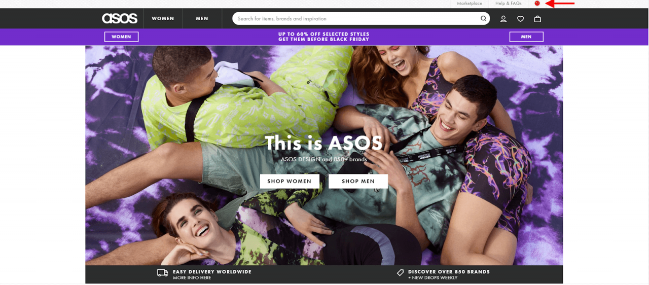 ASOS es una empresa multimillonaria que vende artículos de moda para jóvenes. El sitio es colorido y animado, y utiliza la geolocalización de IP para atraer aún más visitantes. Simplemente elige tu país (¡tienen muchos!) y verás cómo cambia la banderita de arriba.