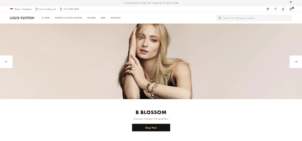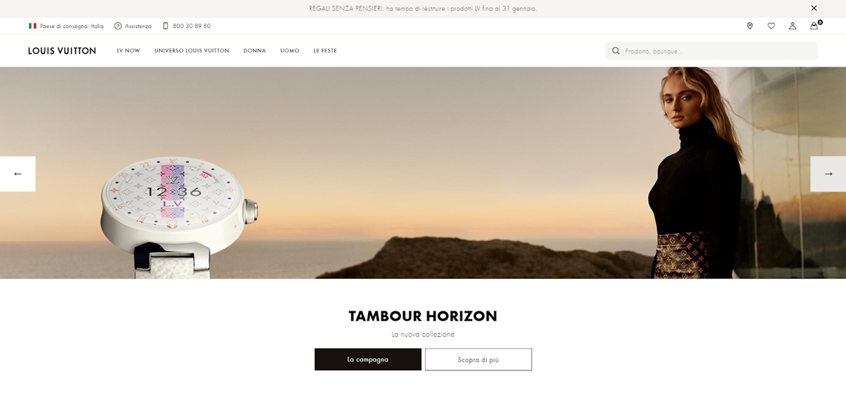 Como una marca global de lujo, Louis Vuitton seguro que sabe cómo causar una primera impresión. La imagen de arriba es su sitio cuando eres de Italia con un idioma, botones y ambiente personalizados.