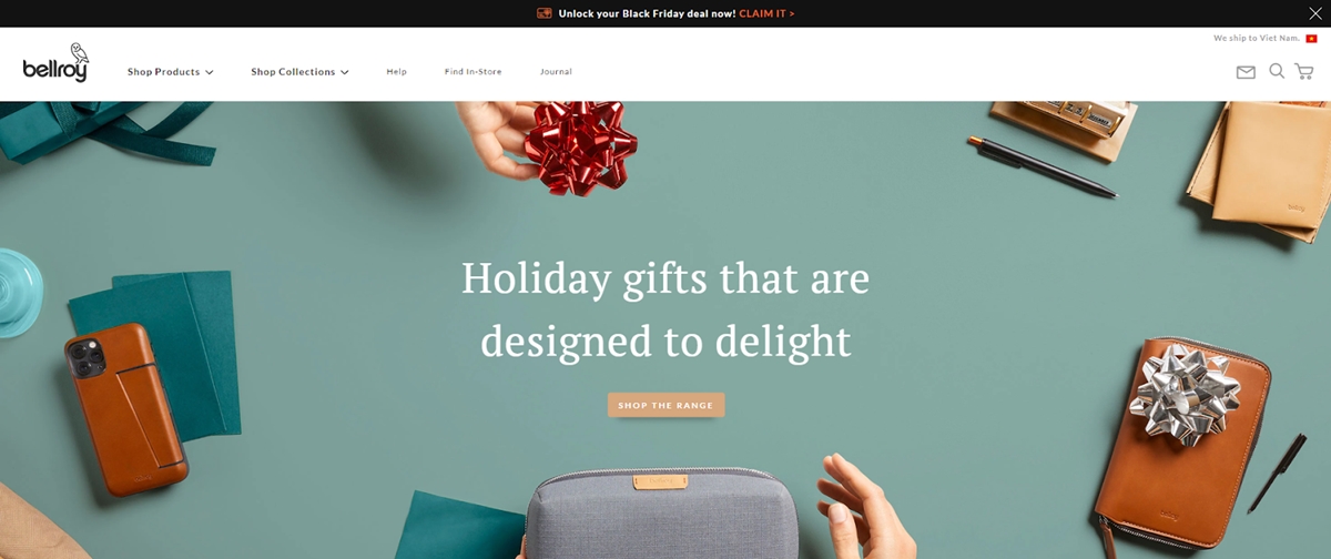 Las tiendas Shopify siempre se ven geniales, ¿no estás de acuerdo? Bellroy vende productos de cuero de primera calidad como bolsos, carteras, fundas para portátiles, fundas para llaves, etc. La tienda está bellamente diseñada con una gran combinación de colores y un enfoque centrado en la imagen.