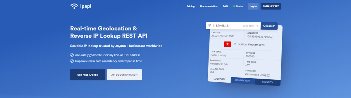 Adecuado para PHP, JavaScript o como API REST, ipapi puede ayudarlo a recuperar información sobre ubicación, conexión, seguridad; y también hacer lo siguiente: