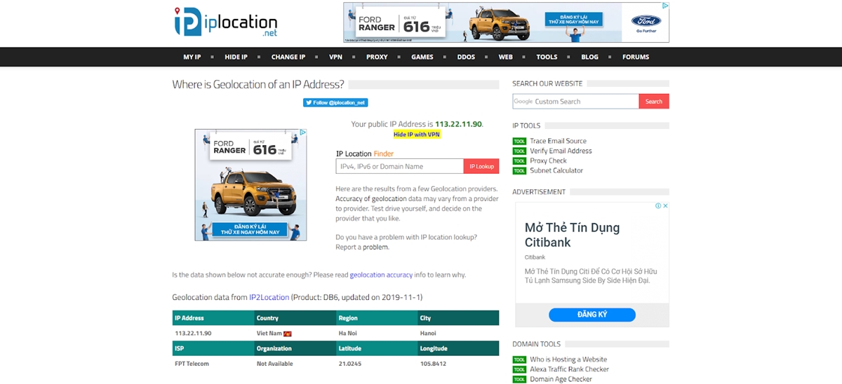 La ubicación de IP es un sitio popular que proporciona geolocalización de IP y recursos de IP, que son detalles sobre todas las direcciones IPv4 e IPv6. Justo en la página de inicio, puede ver la información sobre su propia IP de ubicación, proveedor de servicios de Internet, latitud, longitud y su dirección IP.