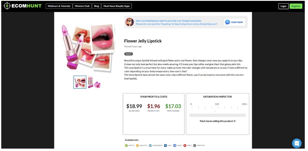 Ecomhunt es esencialmente la selección de los mejores productos nuevos todos los días. A continuación se muestra un ejemplo de uso y gasto de un artículo de lápiz labial: