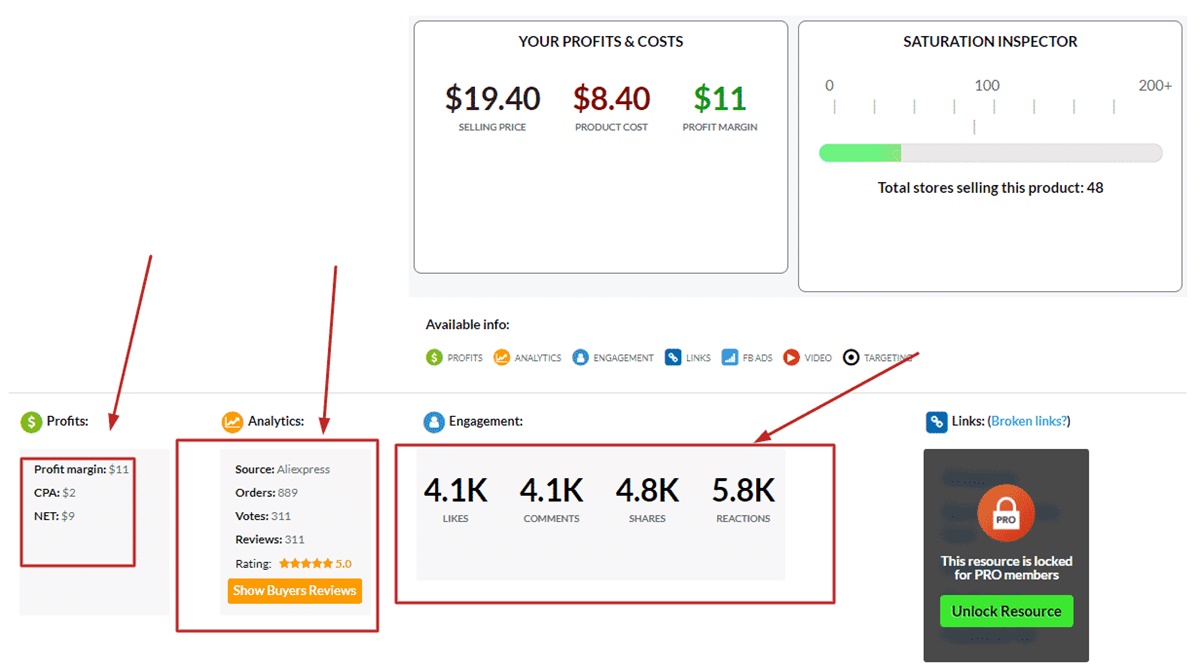 Otro aspecto brillante de Ecomhunt es que obtendrá amplia información sobre los niveles de participación de todos los anuncios y podrá ver todos los márgenes de beneficio actuales del producto .