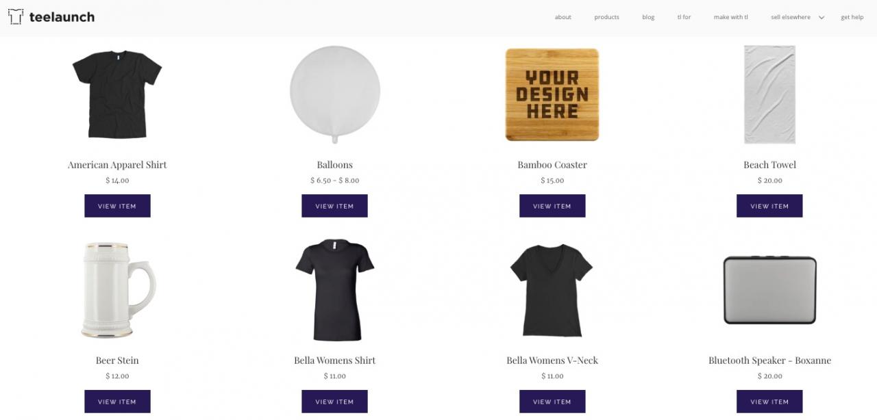 Teelaunch es una aplicación de impresión bajo demanda (POD) que se enfoca solo en las tiendas Shopify. Esto significa que si usa la aplicación, no le proporcionarán una plataforma para vender, pero deberá vincular la aplicación Teelaunch a su tienda Shopify y cargar sus propios diseños y productos para vender. Puede poner sus diseños en artículos de Teelaunch como camisas, bolsos, tazas e incluso cosas como tablas de cortar grabadas con láser. Ellos cobran el precio básico por artículo y usted establece el precio de venta al público. Cualquiera que sea la diferencia, la mantendrá como su ganancia.