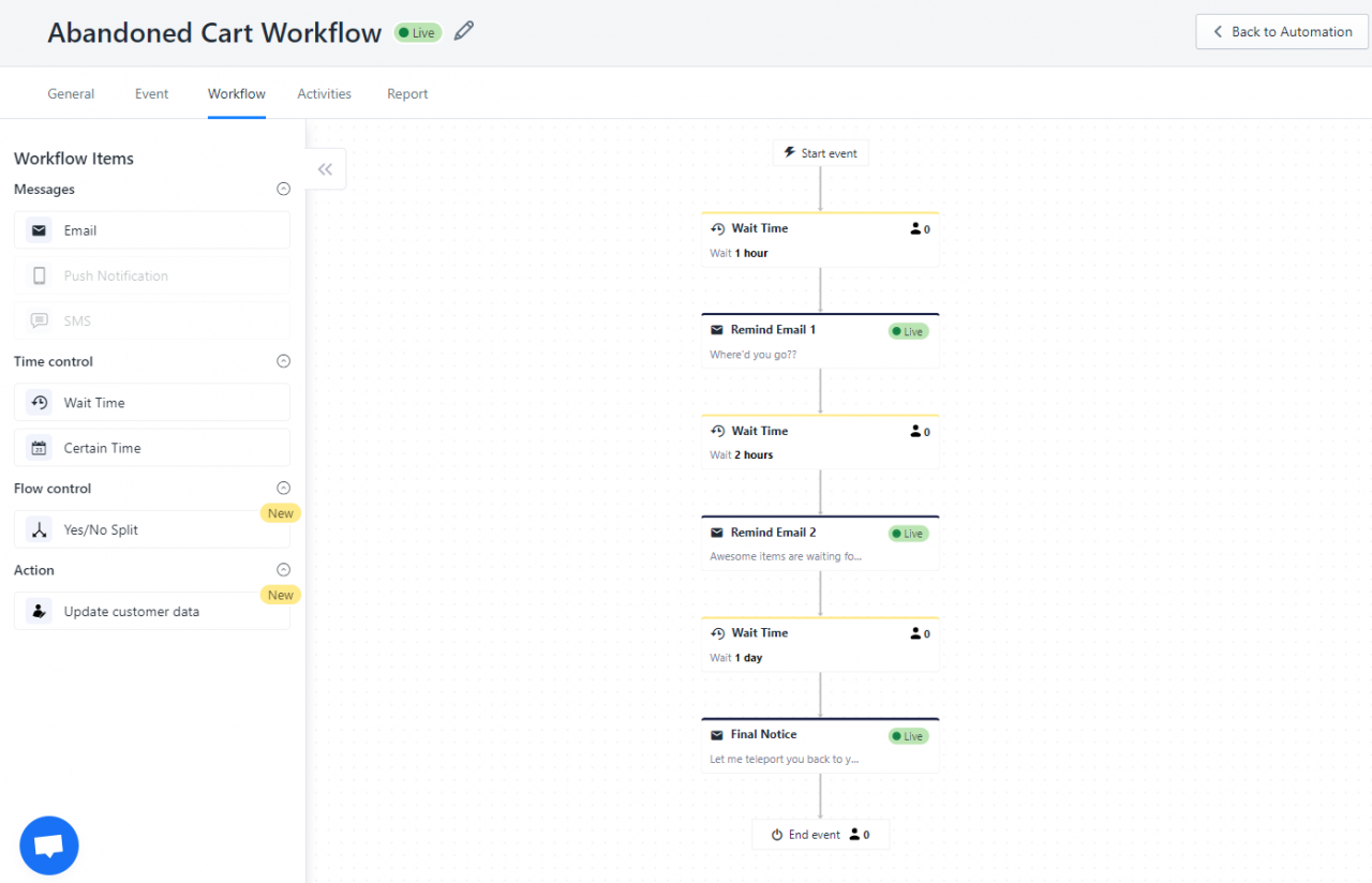 ¿Tiene prospectos atascados en la mitad del embudo? ¿O clientes a los que le gustaría volver a contratar? El flujo de trabajo de correo electrónico de reincorporación funciona de maravilla para que vuelvan al grupo. Esto se puede activar en función del tiempo transcurrido desde la última transacción del cliente.