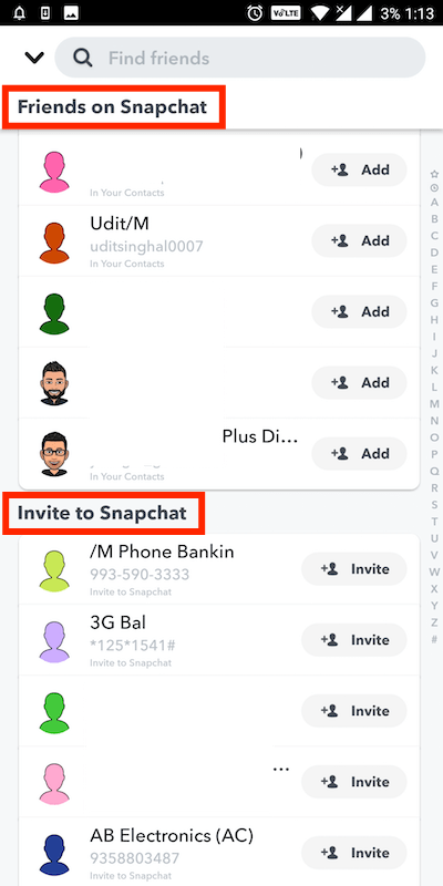 Desplácese hasta el final de la lista y vea aquellos contactos que no tienen Snapchat. Son todos sus contactos que no tienen cuentas de Snapchat y aquellos que no tienen su número de teléfono conectado con su Snapchat o incluso no permiten la coincidencia de números para su cuenta de Snapchat. Si lo desea, puede tocar «+Invitar» para enviarles una invitación para unirse a Snapchat con un texto y un enlace a la aplicación.
