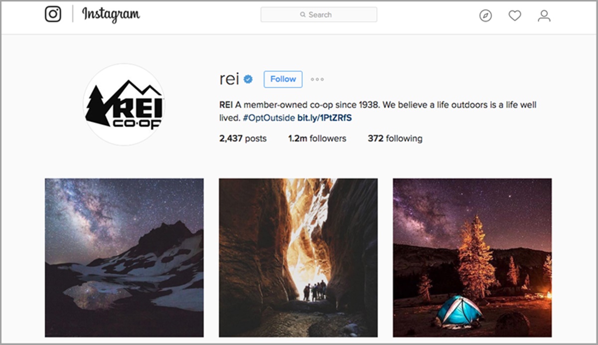 REI es una persona influyente en Instagram con más de 2,3 millones de seguidores. El contenido que publica REI es principalmente sus actividades al aire libre y sus seguidores también son personas que aman especialmente las actividades al aire libre. La lección aquí es centrarse en el contenido que le interesa a su público objetivo. Este contenido no se dirige directamente a su marca, pero debe representar las características y la personalidad en las que se enfoca su marca.