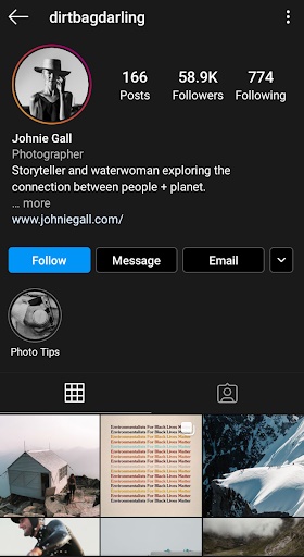 Johnie Gall también es conocido como @dirtbagdarling en Instagram. Es líder en actividades de Instagram. Y ha recibido muchas ofertas de grandes marcas para llevar a cabo sus misiones, incluida Patagonia.