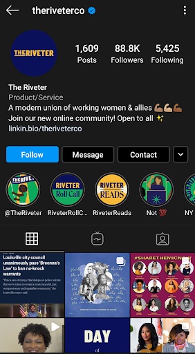 The Riveter los describe como una plataforma comunitaria y de trabajo de vanguardia para mujeres y defensoras. Eligen interactuar con la audiencia en Instagram a través de conversaciones. El contenido de estas conversaciones a menudo gira en torno a las mujeres en los negocios y el liderazgo. The Riveter se ha convertido en un auténtico influencer en este sentido. The Riveter tiene muy clara su misión y utilizan Instagram como herramienta para presentar el evento e invitar a la participación de toda la comunidad.