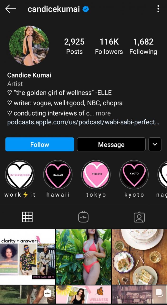 Candice Kumai es autora de un libro sobre el cuidado de la salud Kintsugi Health: The Japanese Art of Nourishing Mind, Body, and Spirit , basado en la herencia y la experiencia nutricional de Japón. Además, es columnista de las revistas Girl Boss y Elle. Sin embargo, la mayoría de la gente la conoce como una influenciadora de Instagram.