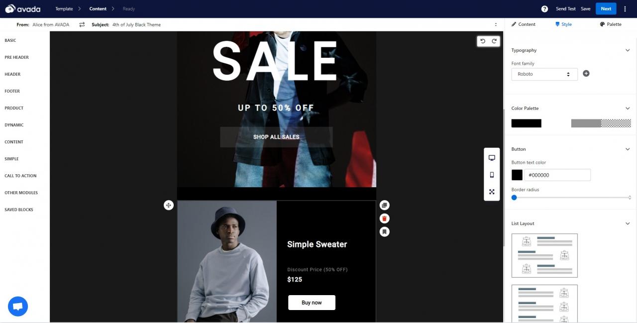 Por ejemplo, cuando desea diseñar una plantilla para un correo electrónico de ventas que necesita un poco de emoción, puede seleccionar un tipo de letra más grueso para que sus mensajes sean más fuertes. En la plantilla de correo electrónico anterior que creamos para el Día de la Independencia, se seleccionó el tipo de letra Roboto blanco sobre fondo negro para que la información del producto sobresaliera más.