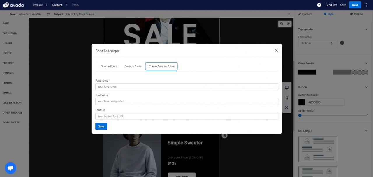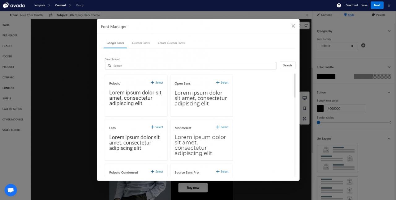 Con el diseño de correo electrónico como parte central, AVADA Marketing Automation entiende que cada empresa debe poder usar sus fuentes personalizadas dentro de sus correos electrónicos para representar su identidad de marca. Por lo tanto, hemos agregado fuentes personalizadas adicionales para que no necesite codificar o insertar manualmente ningún tipo de letra en su fuente.