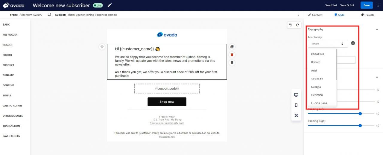 Como puede ver en la imagen de arriba, puede seleccionar la familia de fuentes para su correo electrónico en la pestaña Estilo al hacer clic en cualquier elemento al diseñar una campaña. Además de todas las fuentes seguras mencionadas en la sección anterior, AVADA Marketing Automation tiene algunas fuentes más seguras para más enfoques en el diseño.