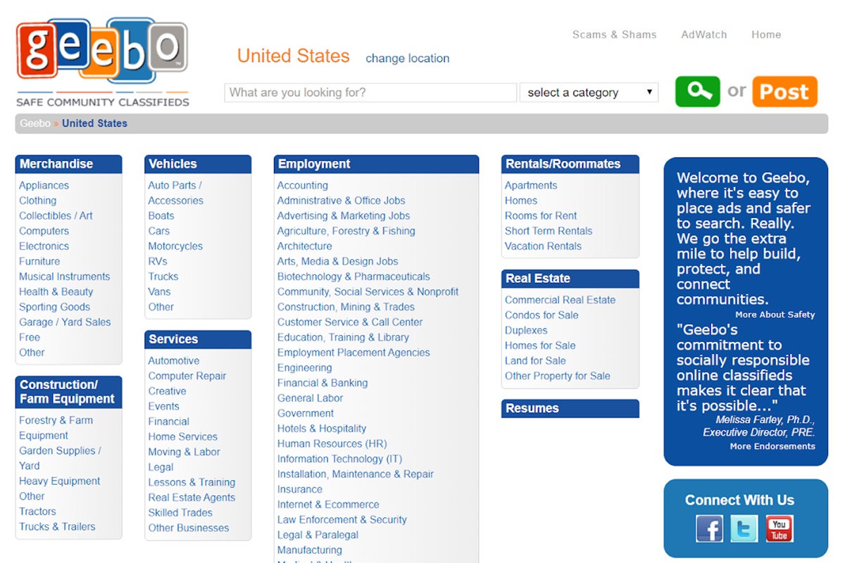 Geebo es ampliamente confiable por su prioridad en seguridad y protección entre otros en la comunidad clasificada. La plataforma verificará dos veces sus listados antes de que sus anuncios clasificados se publiquen. Este proceso tomará bastante tiempo, pero la espera es lo suficientemente valiosa como para que la nueva audiencia te identifique como un vendedor examinado.