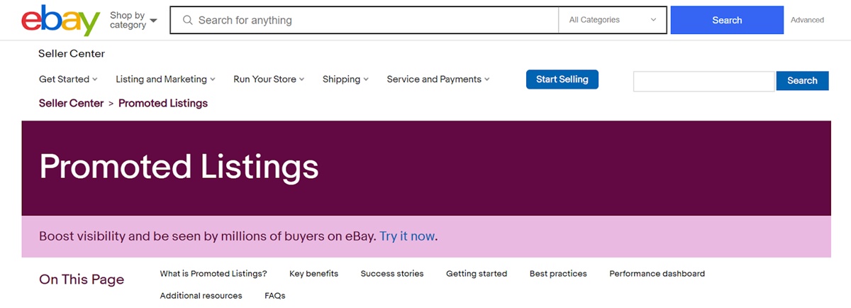 En 2017, la plataforma agregó un conjunto completamente nuevo de herramientas publicitarias para ayudar a los vendedores a llegar a sus clientes potenciales de manera más efectiva. Hay dos opciones de publicidad disponibles, pero la más utilizada es el programa de publicación de anuncios que promociona sus productos en eBay en función del rendimiento. La otra opción está sesgadamente optimizada para marcas más grandes que buscan posiciones más altas en el mercado. Independientemente de los servicios de publicidad de eBay que elija, la visibilidad de sus listados de productos sin duda aumentará hasta en un 30%.