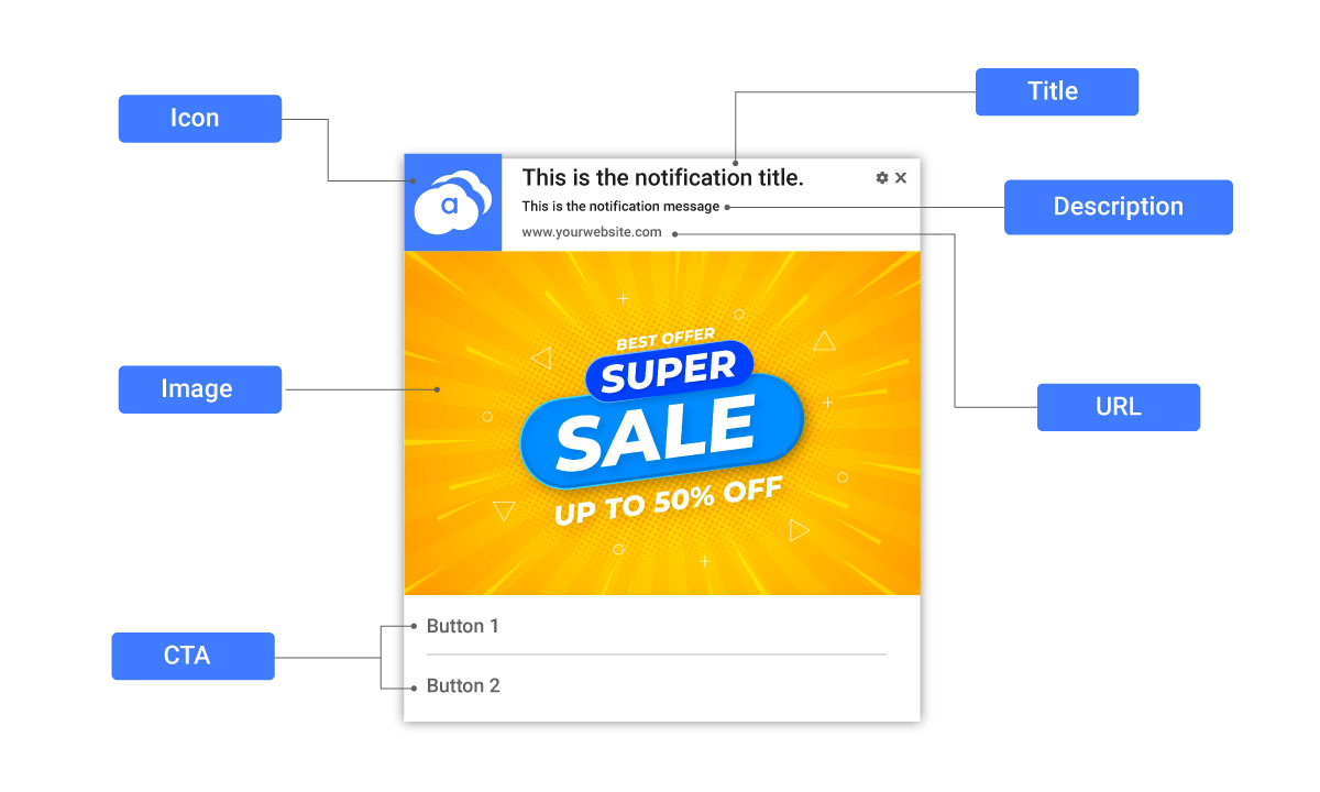 Las notificaciones automáticas del navegador web se componen de diferentes elementos, que incluyen ícono, título, descripción, URL, imagen y CTA (llamadas a la acción). Todos los elementos son modificables para cada notificación push; si quieres, puedes cambiar el icono, la imagen, el texto y el CTA de cada uno.