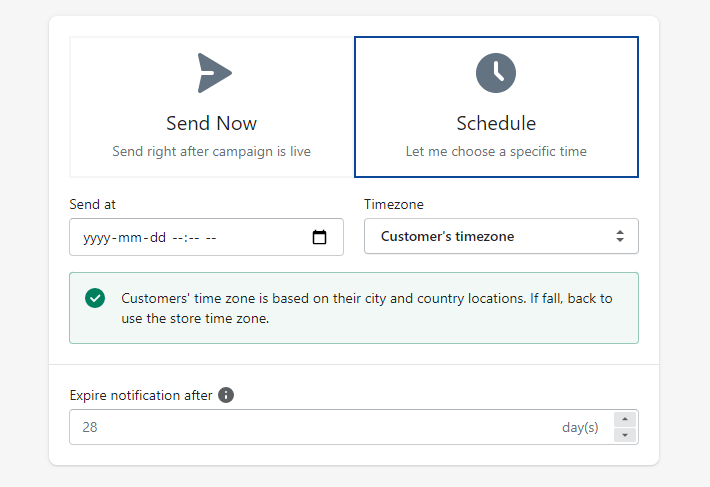 Puede evitar cualquier error de esta naturaleza optimizando por zona horaria del usuario. Como plataforma confiable de notificaciones automáticas, AVADA Commerce le permite enviar la campaña de inmediato o programar el envío más tarde. Puede seleccionar una fecha y hora específicas para enviar su campaña de notificaciones automáticas, según la zona horaria de su usuario.