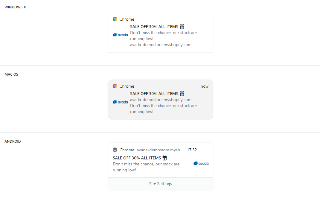 Las notificaciones automáticas también varían en apariencia entre navegadores y sistemas operativos. Algunas notificaciones automáticas usan centros de notificación nativos, mientras que otras no; esto también varía según los navegadores y los sistemas operativos.