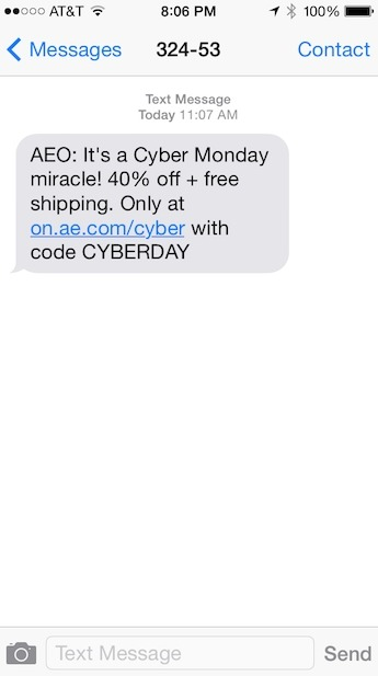 Este es un excelente ejemplo de una campaña de marketing por SMS que no suena demasiado ventajosa. American Eagle va directo al grano con el mensaje de texto e informa a los destinatarios que hay una oferta en Cyber Monday. Hay un enlace en el mensaje con un código único que les ayudará a rastrear el tráfico y los pedidos provenientes de la campaña de SMS.