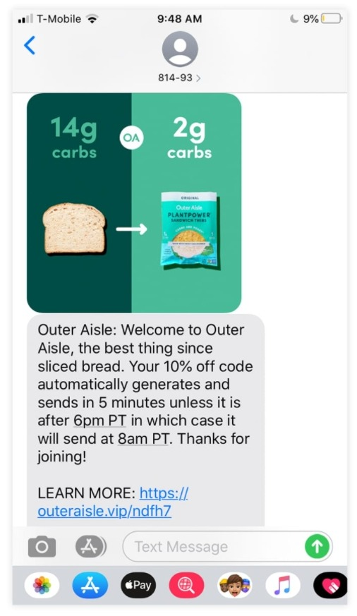La bandeja de entrada de mensajes de texto suele ser más privada que la bandeja de entrada de correo electrónico, ya que está llena de mensajes de familiares y amigos. Por lo tanto, es una buena idea agradecer a los suscriptores de su lista por compartir sus números. Esto puede ser una recompensa simple como un cupón del 10% para sus productos, como lo hizo Outer Aisle. También incluyeron una bonita imagen para explicar cómo su producto es mejor que el pan normal.