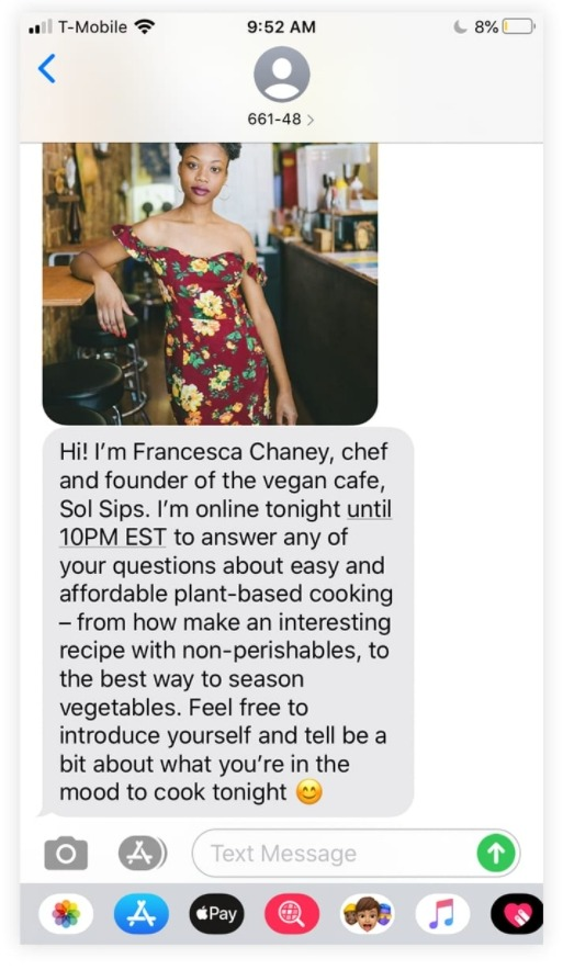 Si su marca es experta en un campo, entonces un mensaje de texto es una forma única de brindar su valor a los clientes. Tal vez tenga consejos increíbles sobre la rutina del cuidado de la piel o recetas de cocina útiles, entonces considere compartir consejos semanales con su audiencia. La marca Equal Parts va un poco más allá al permitir que los clientes envíen mensajes de texto a un verdadero chef si tienen alguna pregunta.